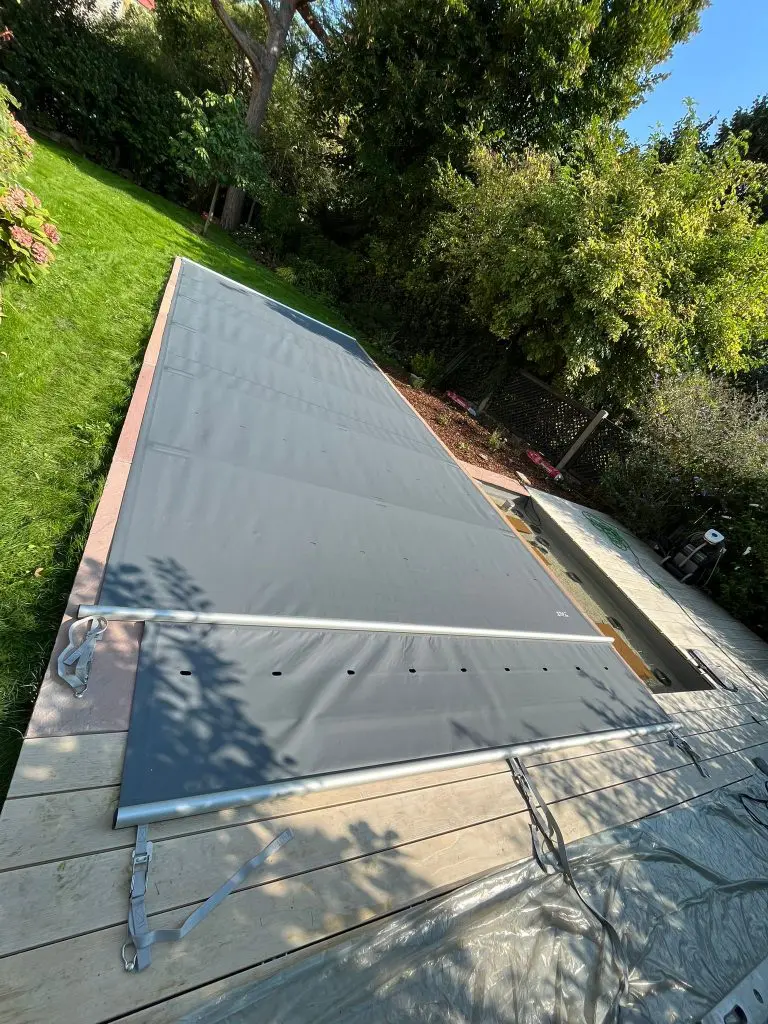 Ein ganz wesentlicher Punkt von Abdeckungen dieser Art ist der große Platzbedarf. Neben dem Pool muss die gleiche Fläche vorhanden sein, damit die Abdeckung ausfahren kann. Diese Fläche kann auch nicht anderwärtig genutzt werden. Und sollte dieser Platz aus Rasen bestehen, bin ich nicht sicher, ob dieser die Abdeckung bei großer Hitze aushält. Ich gestehe, dass ich persönlich so eine Abdeckung aber auch noch nie verwendet habe.