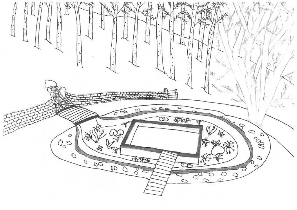 Der Schwimmteich hatte in der Mitte ein 2m tiefes Betonbecken mit ca. 24 m2, dessen Oberkante 40cm unter der max. Wasserhöhe endete. Rundherum 3-4 m breite Pflanzzonen, die schräg von 60 cm Tiefe bis an den Rand reichten. Hier die Skizze des Teiches.